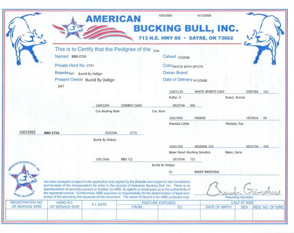 | This combination has already produced MANY FUTURITY WINNERS!!! Including Cowboy Crash, Cowboy Splash and Cowboy Trash. We went a step further and bucked our Houdini females and flushed the two rankest ones. THEY WERE RANK!!! This heifer is out of our Houdini Cow #722 which was the rankest of the two. This heifer has everything a person should want to raise great buckers. |