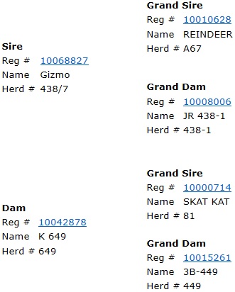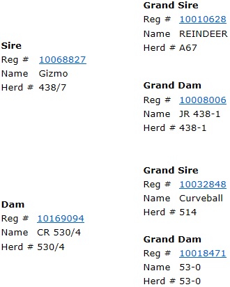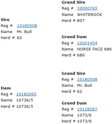 | This heifer is sired by #62 Mr. Bull - ABBI# 10180508. Son of Whiterock out of #686 Horse Face a Kish cow. Whiterock is a son of Whitewater. Mr. Bull has had multiple trips to the NFR & PBR Finals - see probullstats. He is up there with being one of the top sires in the industry. Her dam is also sired by Mr. Bull and her granddam, 1073/6 is a Full Sister to Roy! |