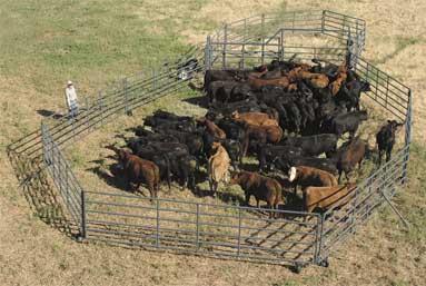 One person can set up the Rawhide Portable Corral in about 10 minutes ready to contain 150-400 head of cattle without lifting a panel. The self contained system easily pulls down the highway at the speed limit and fits through any gate your pickup will. Works on extremely uneven terrain. Over 20 different corral configurations are possible. Wheels on each panel with electric over hydraulic jack eliminates lifting and saves time. Includes frame gates for sorting. Patent Pending. CLICK HERE to watch a VIDEO and see for yourself how easy the Rawhide Portable Corral is to set up. |